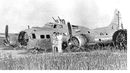 THE PHOTOGRAPH ABOVE is of our belly-landed Miss BeHaven, taken in the summer of 1945 at the landing location. You can see the aircraft was being cannibalised by the locals at that time. The damage from the landing and flak is visible. Also note the pilot had feathered two propellers prior to their bail out.