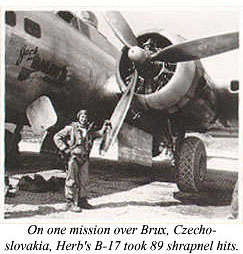 AND SO, UP INTO THE WILD BLUE YONDER, and the big day, little did I know, was started! Everything went smoothly with the exception of the supercharger on the No.1 engine, but we figured with three other engines, we would have no trouble whatsoever getting there. I was having a final cigarette and singing "Oh, what a beautiful morning, Oh, what a beautiful day", prior to putting on my oxygen mask, when I noticed that my chute had popped open. I never gave a thought then to any serious developments on account of this, but I remember thinking what a ribbing I would take from the boys at the base when they heard about it. However, soon after I made this interesting discovery, the Navigator informed us that we were approaching our IP and my thoughts quickly turned to the more serious business ahead. We were flying in "Purple Heart Corner" so we had a pretty good view of the boys ahead going through the flak, or I should say, disappearing in the flak. The whole sky ahead was black, just as it was the last time we were up there. It seemed funny to see and yet satisfying, too, watching what appeared to be toy airplanes in a cloudless sky plunge headlong into that black mass, disappear for a time, and then to reappear on their "rally". It seemed to radiate confidence back to us exhibiting a modest pride in a good job well done.