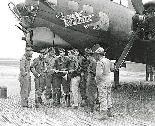 We hit the initial point right on the button only to have to make a 360 to keep from rubbing noses with another group chiseling in on our right. "Frenchy" Oulette the Group Waist Gunner was throwing out chaff like a demon all this time, and he swears to this day that the reason the flak was so bad over the target was because we ran out of chaff before bombs away. Could be but for some reason they were hitting us with everything they had. Half way down the run the bombardier who claimed to be pretty busy all this time took time out to take note of the evidence of the gunners accuracy "this damn nose is full of holes!" He sounded like he thought he was the only guy getting shot at but there wasn't one man in the crew who couldn't count many a close hit. In fact the ship was so full of holes that if it had started raining all of us would have drowned to death. About this time when the flak really started hitting close and the ship was bouncing like a toy balloon, the bombardier asked the pilot to level the ship. Major Ewing rang out with "This so and so is as level as it's ever going to be!" Now the bombardier didn't like to doubt his word, but the ship was in about a 45 degree bank at this time and looking out the side window you could see the ground below, but the pilot said she was level-so level she was. The target was smoked over and we couldn't see it.
